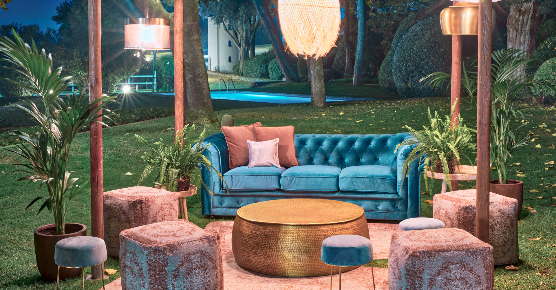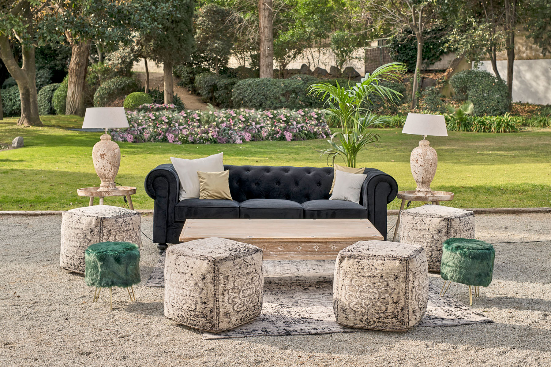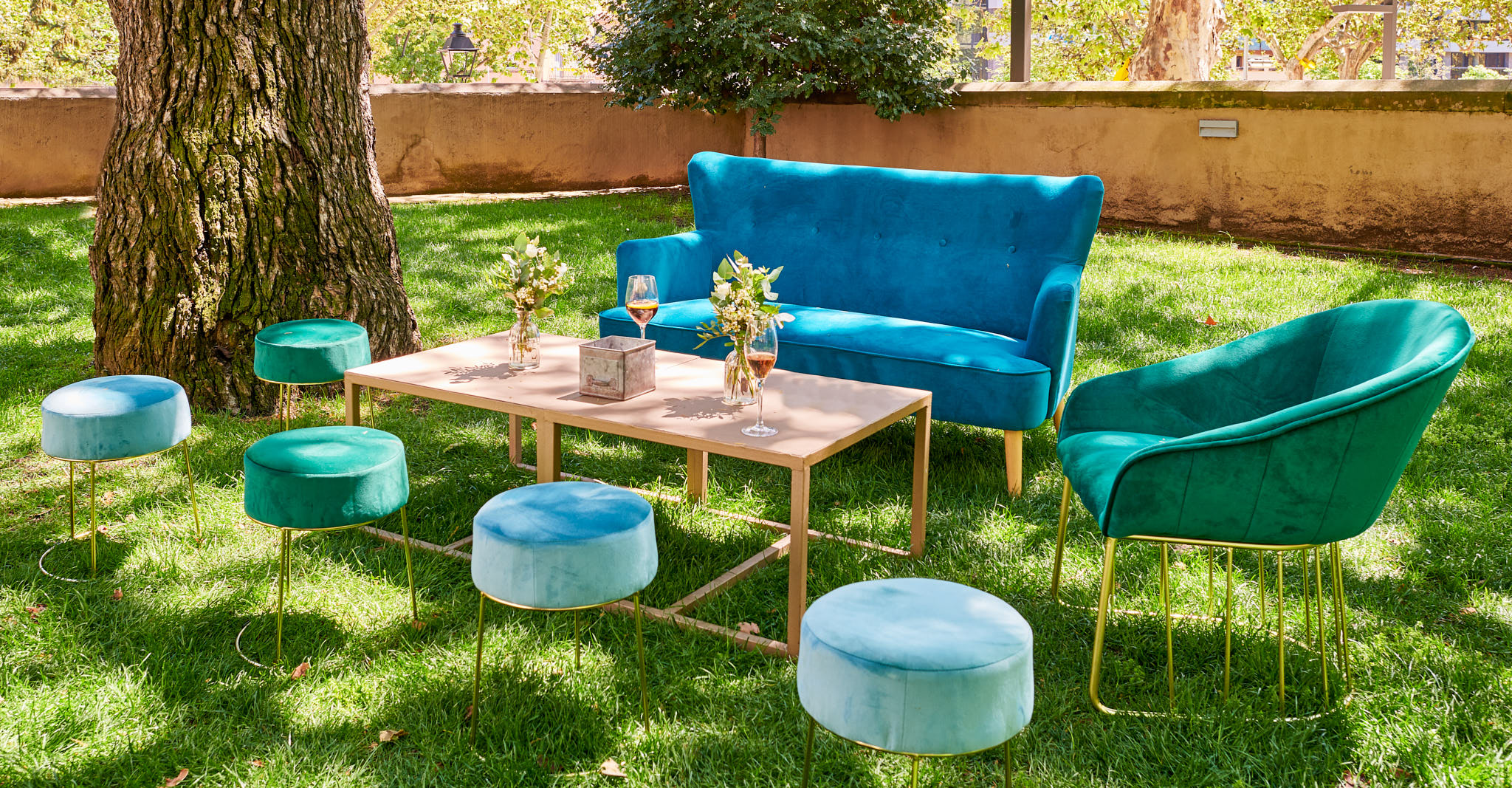 La mayoría de eventos se realizan en espacios abiertos. El chillout al aire libre nos proporciona el poder disfrutar del entorno y relajarnos en el idílico ambiente del evento, asegurándonos el éxito del espacio.